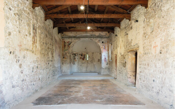 Ma è all’interno che scopriamo davvero la sua lunga storia. Le murature in pietra a vista sono qua e là intonacate per accogliere degli affreschi e nell’abside scopriamo ben tre cicli pittorici sovrapposti: il più recente è della metà del Quattrocento, il precedente si data alla metà del Trecento e il più antico risale alla fine del Duecento.